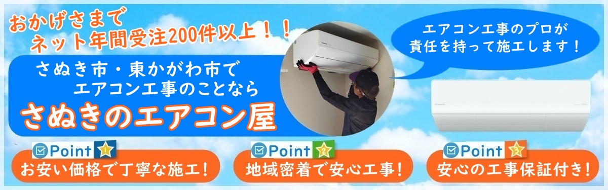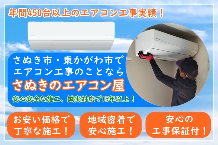 「さぬき市 エアコン取り付け」や「東かがわ市 エアコン工事」とネット検索すると複数の工事業者が表示されるかと思いますので、価格だけではなく当社のような実績のあるエアコン工事業者や地域密着の空調会社に依頼する事をオススメします。